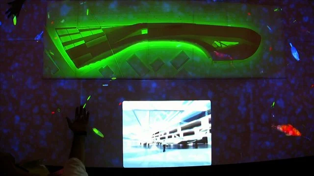 In Electroland's Mira 2008, virtual fish and other creatures were projected onto a table which was transformed into a giant multitouch display. Touching the creatures triggered video, sounds, and animations.